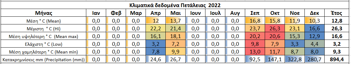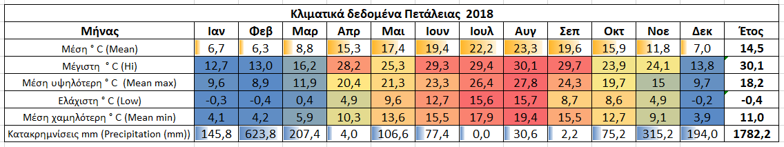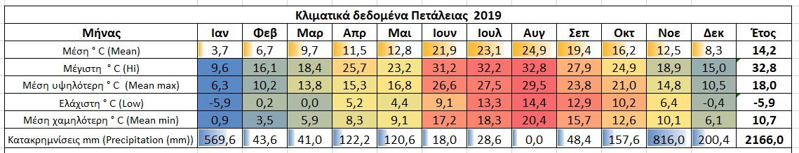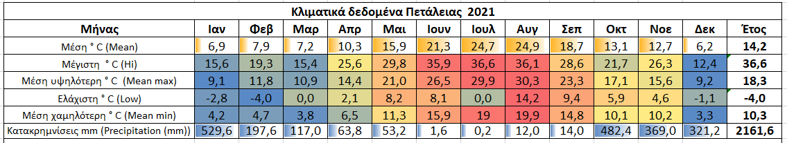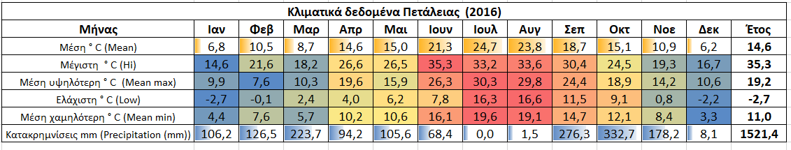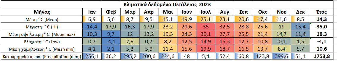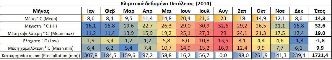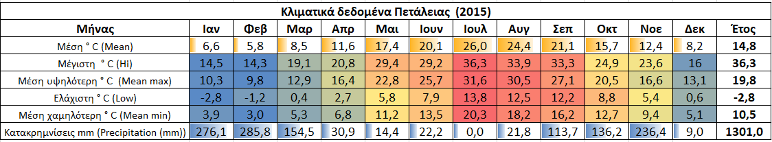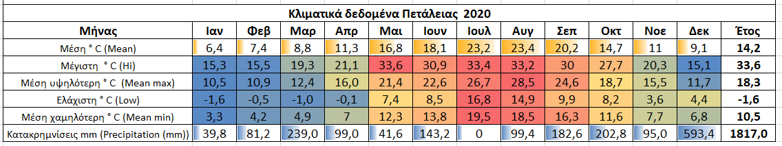 Πίνακας: Μηνιαίες και ετήσιες κλιματικές τιμές της μέσης, μέγιστης και ελάχιστης θερμοκρασίας στην Πετάλεια, για τις κλιματικές περιόδους 2014-2024. Πηγή: Ιστορικό κλιματικό αρχείο ΝΟΑΑ.